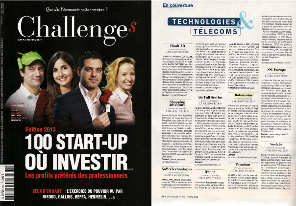 April 4th 2013: Robotswim is a part of "Top 100 start-up to invest in" of weekly newspaper Challenges