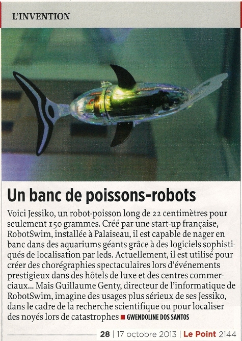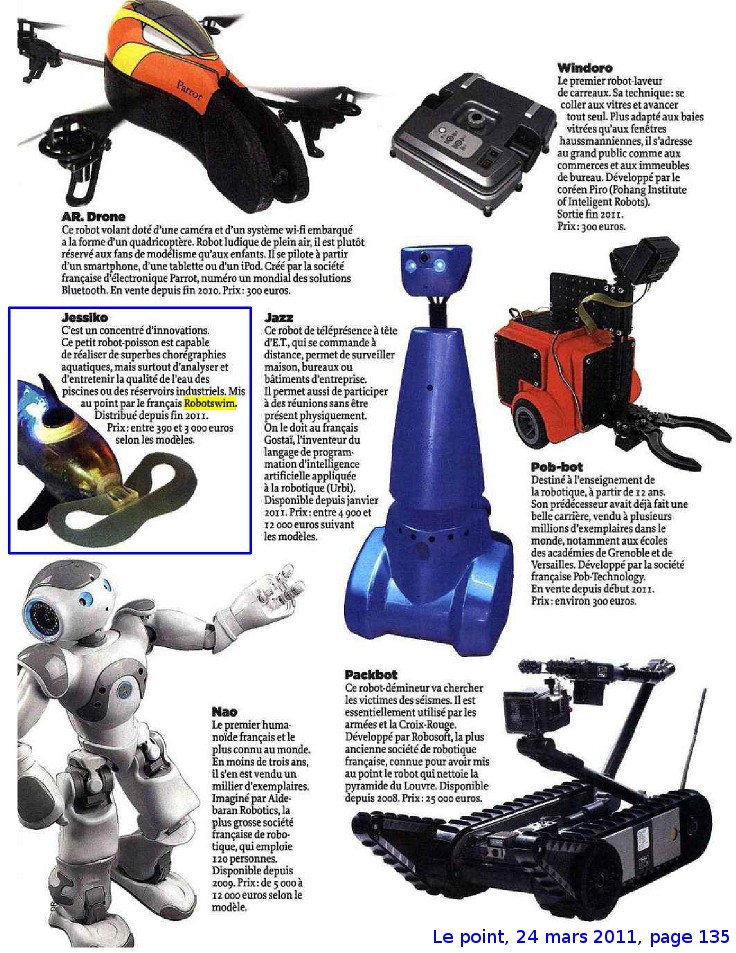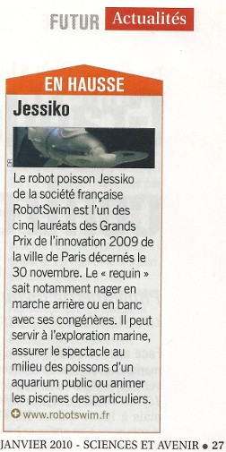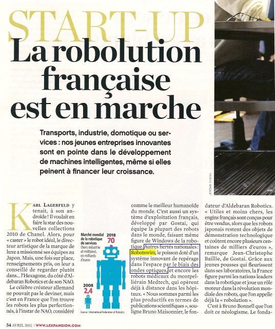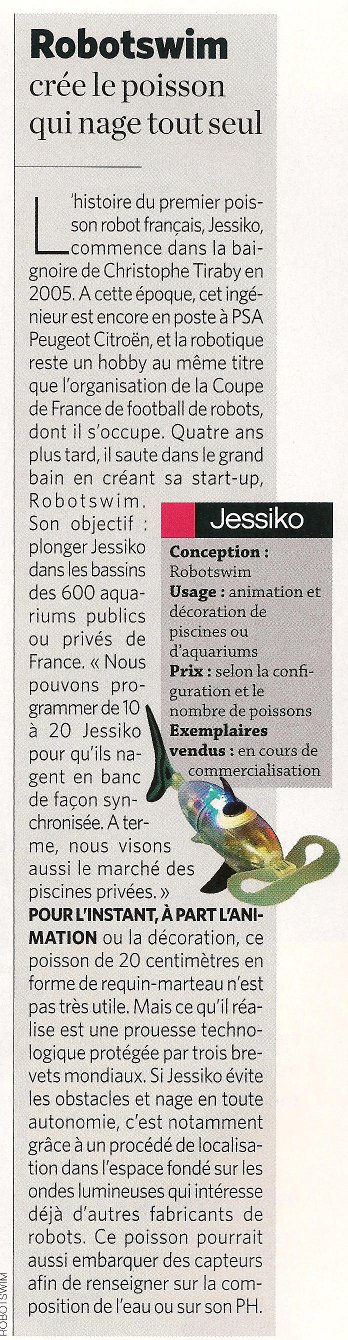 A presentation of Jessiko in the last issue of "L'Expansion"! Robotswim ans Jessiko are presented in the issue 762 (April 2011) of the French economy magazine "L'Expansion", in an article called "La robolution française est en marche" ("The French robolution is on the march"), pages 54 to 58. More informations on http://lexpansion.lexpress.fr/...