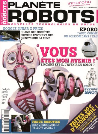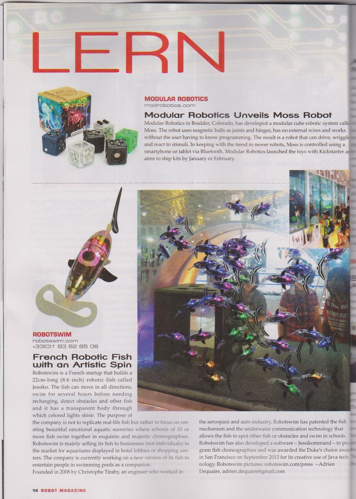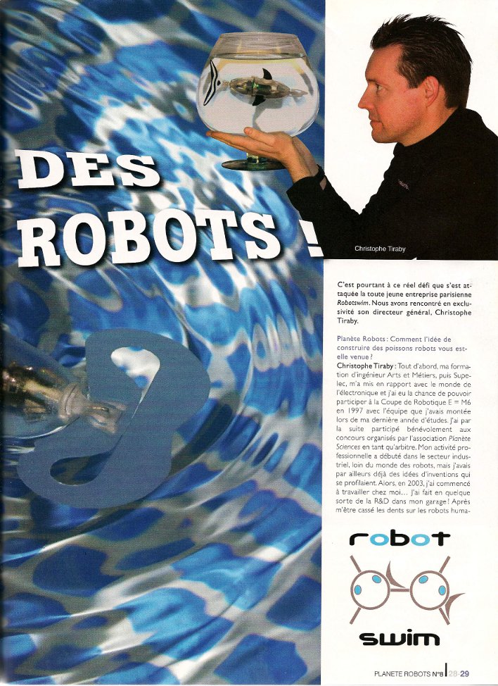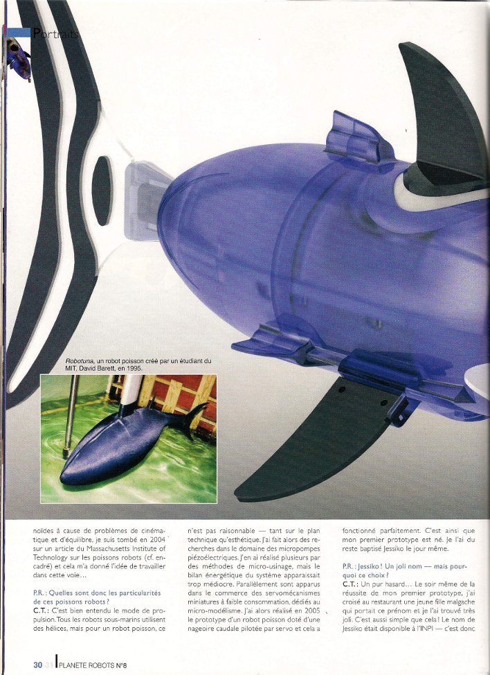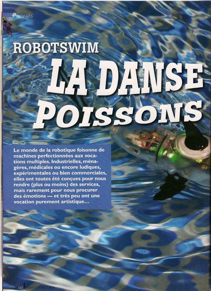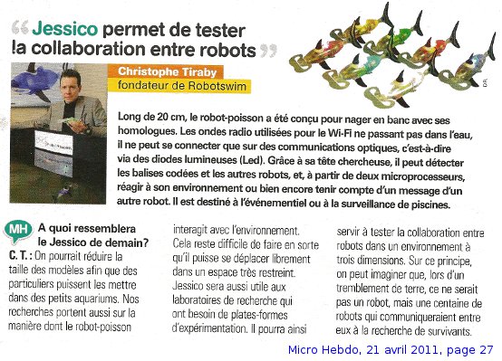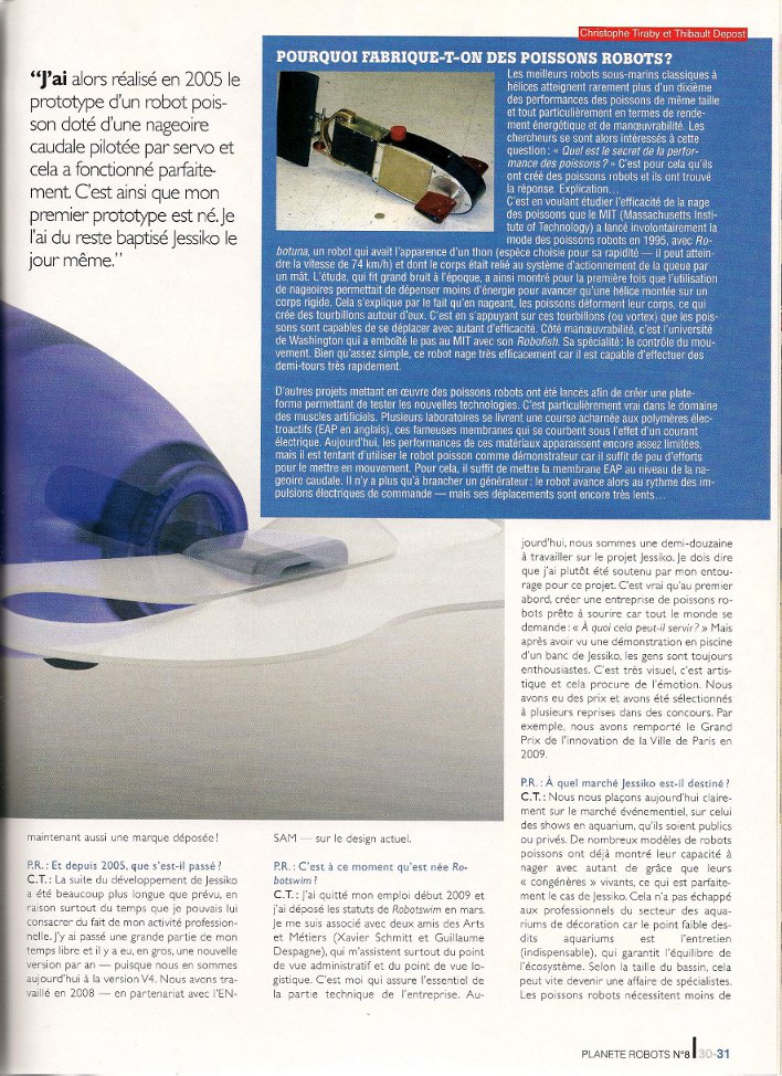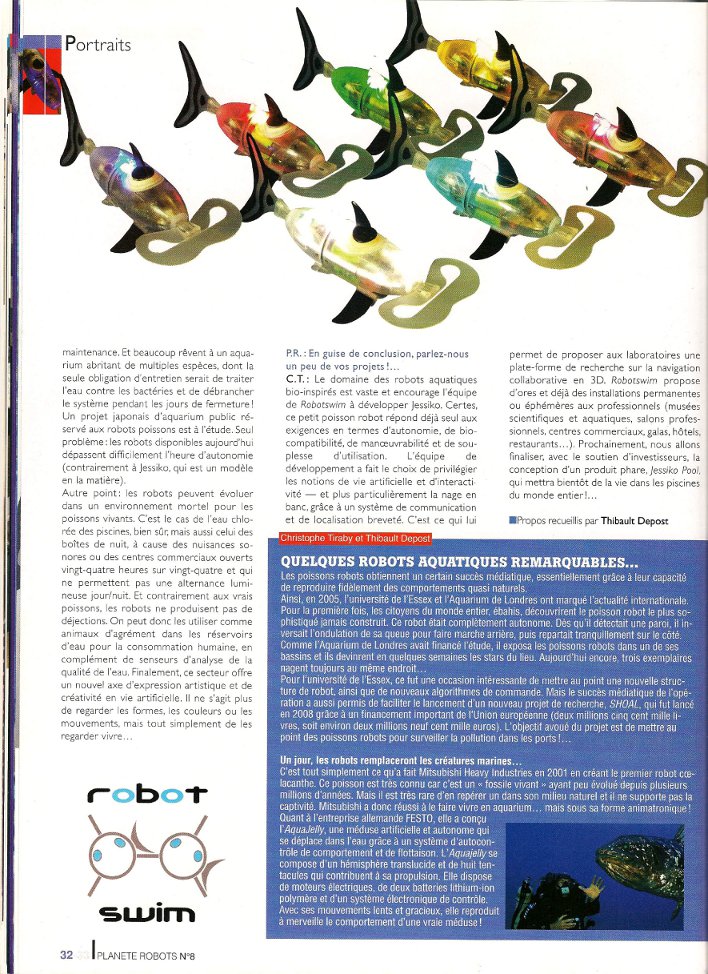 An 5 pages article about Robotswim in March-April 2011 issue of Planète Robots Interview of Christophe Tiraby and presentation of Jessiko with boxes reminding history of robotic fishes ! Find us quickly in Planète Robots #8, a famous French magazine about robotics, pages 28 to 32: http://planeterobots.com/ !  Contents of the article: