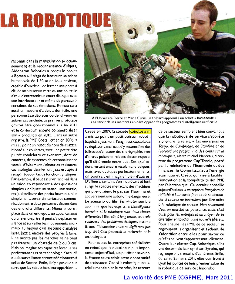 The French CGPME newspaper, "La volonté des PME" (Will of small businesses), is speaking about Robotswim Robotswim is quoted in an few pages article about French small businesses in robotics:  Click to zoom...