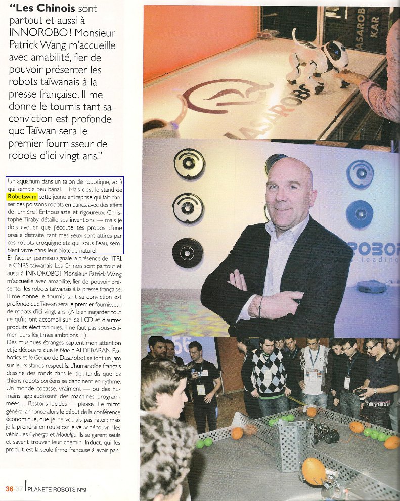 Robotswim quoted in "Planète Robots" article about Inno-robo. Yves Martinez, reporter for Planète Robots, describe his visit of Inno-robo, including a paragraph about Robotswim!  Click to zoom...
